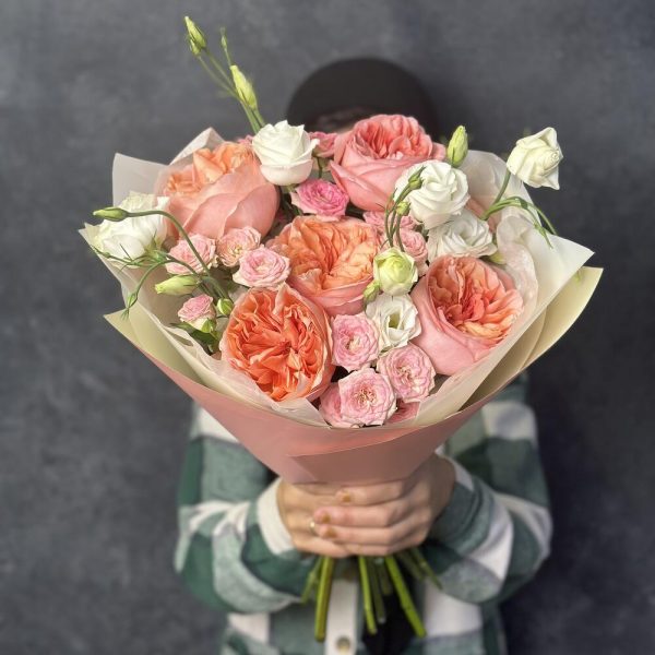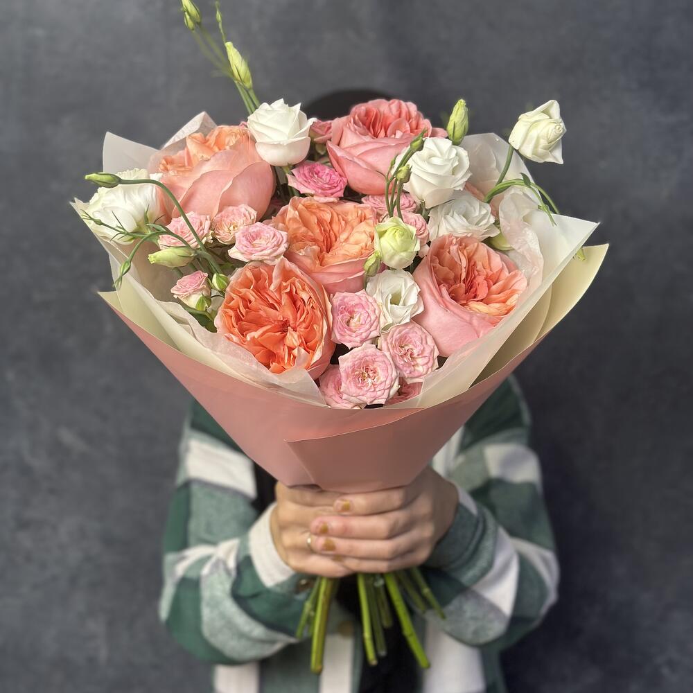 Авторский букет с пионовидными розами и эустомой