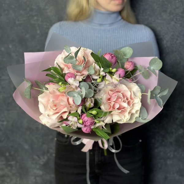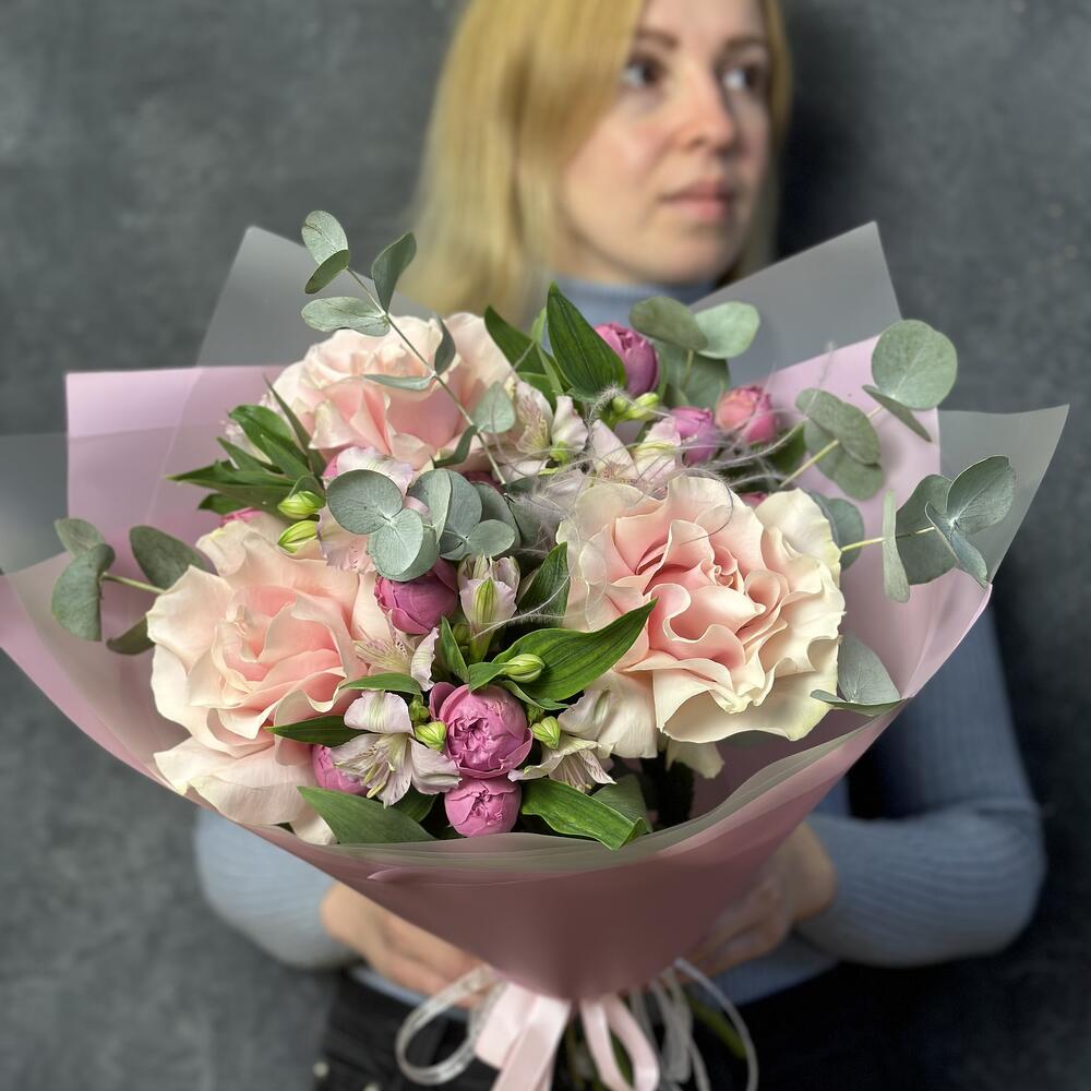 Авторский букет «Прованс» из розовой французской розы, альстромерии и кустовой пионовидной розы с эвкалиптом в Кандалакше